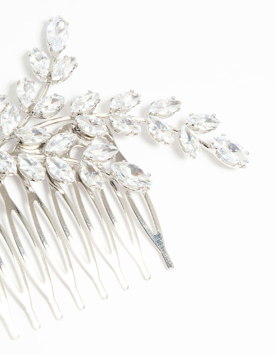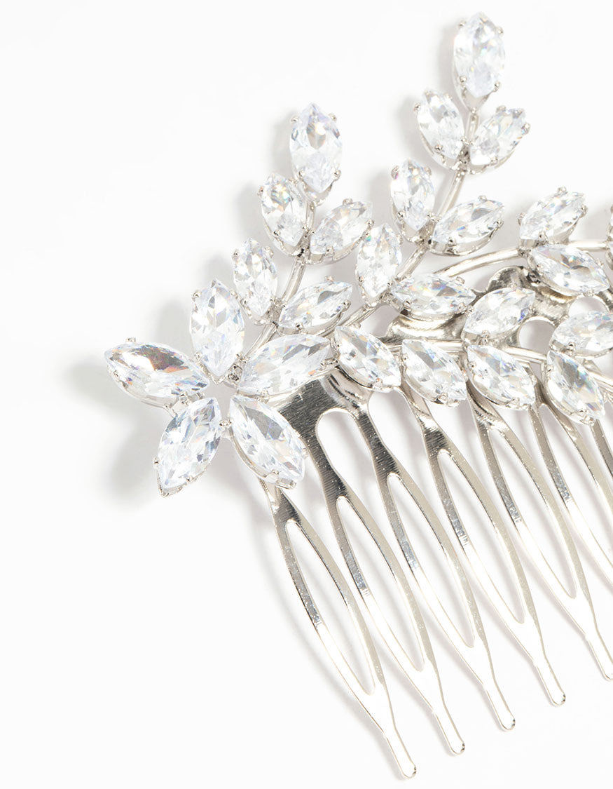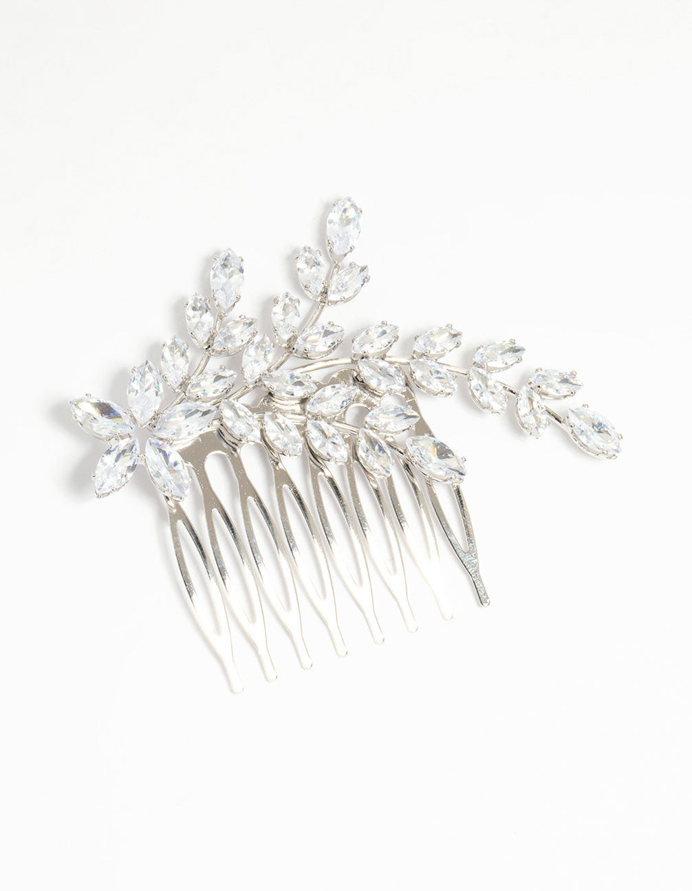 Shine bright with this Silver Diamante Flower & Leaf Hair Comb! This stunning hair comb features delicate diamante flower and leaf motifs for an elegant addition to any bridal hairstyle.
