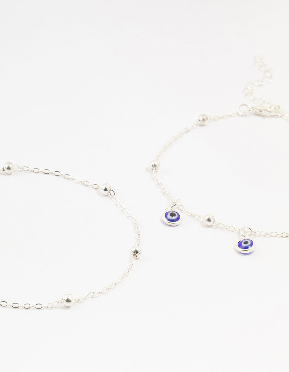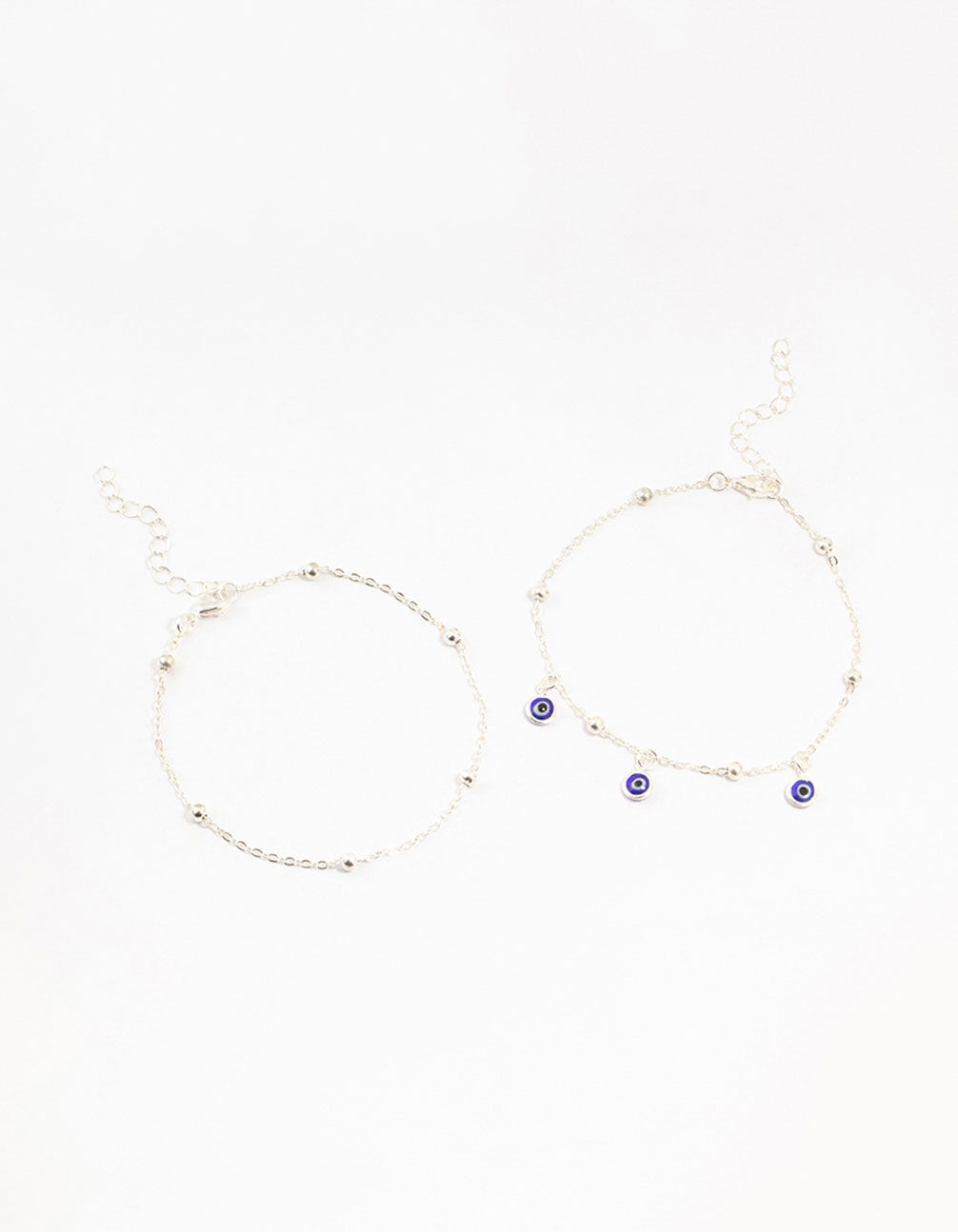 Step up your accessory game with this Silver Evil Eye Anklets Pack, the perfect jewellery duo for adding a playful, protective vibe to your look. Featuring delicate silver-toned chains and charming blue evil eye details, these anklets are ideal for sunny days or beach getaways. Layer them together for a statement look or wear one solo for a touch of subtle sparkle. Perfect with sandals, trainers, or even barefoot strolls, these anklets are a must-have for adding personality to your outfit. Stylish, versatile, and effortlessly chic, they're the ultimate finishing touch to your body accessories collection!