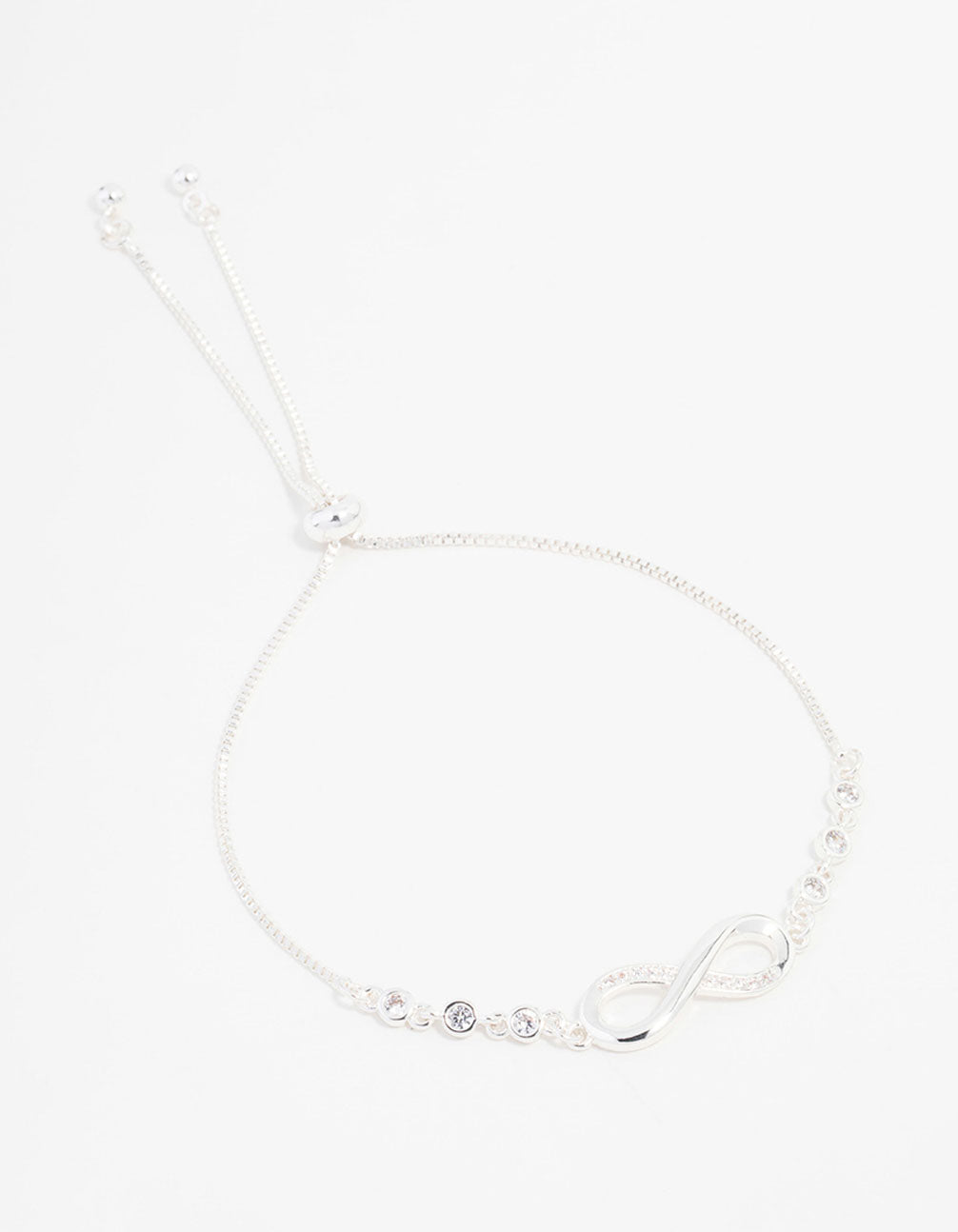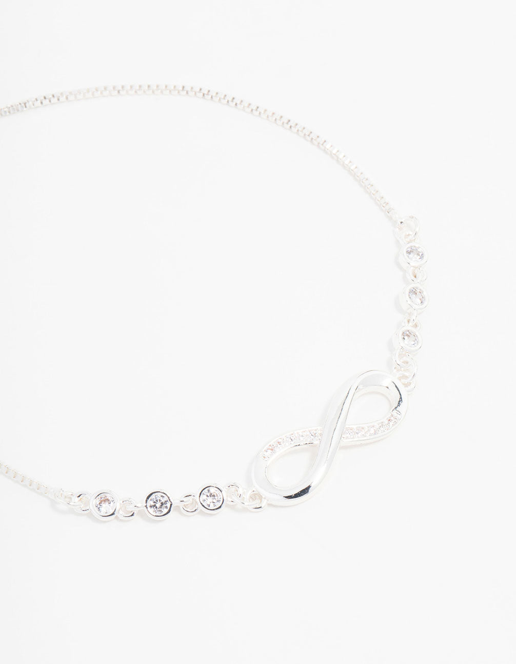 Make an eye catching yet simple statement using the trendy infinity motif. This stunning Silver Plated Bling Infinity Toggle Bracelet signifies forever and is a fun timeless piece for gift giving or as your next go to accessory.