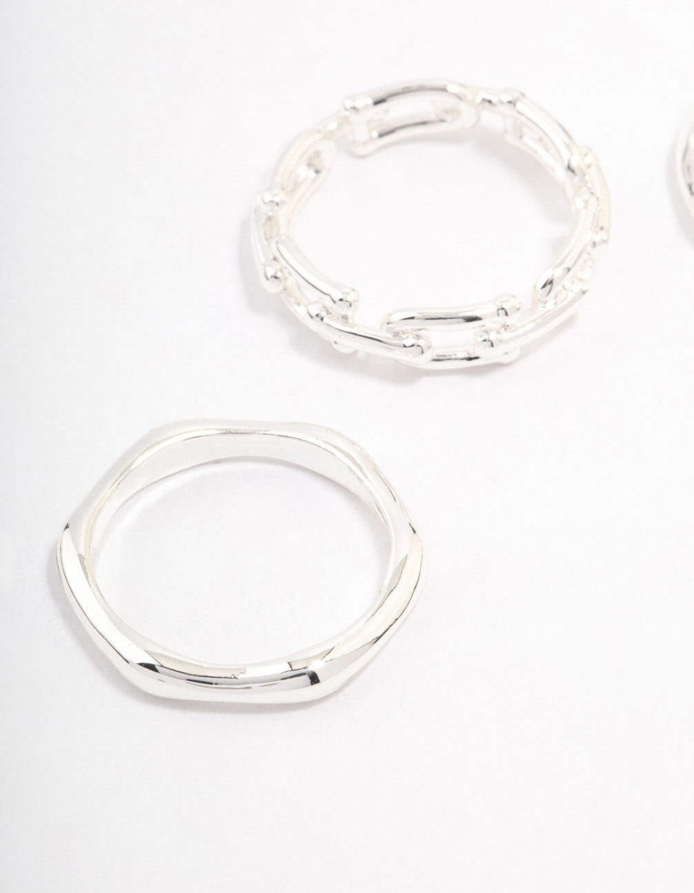 These timeless stacking rings are plated with real silver and feature a unique, chain link design.