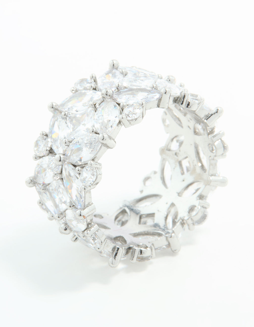 Silver Plated Cubic Zirconia Floral Wide Band Ring