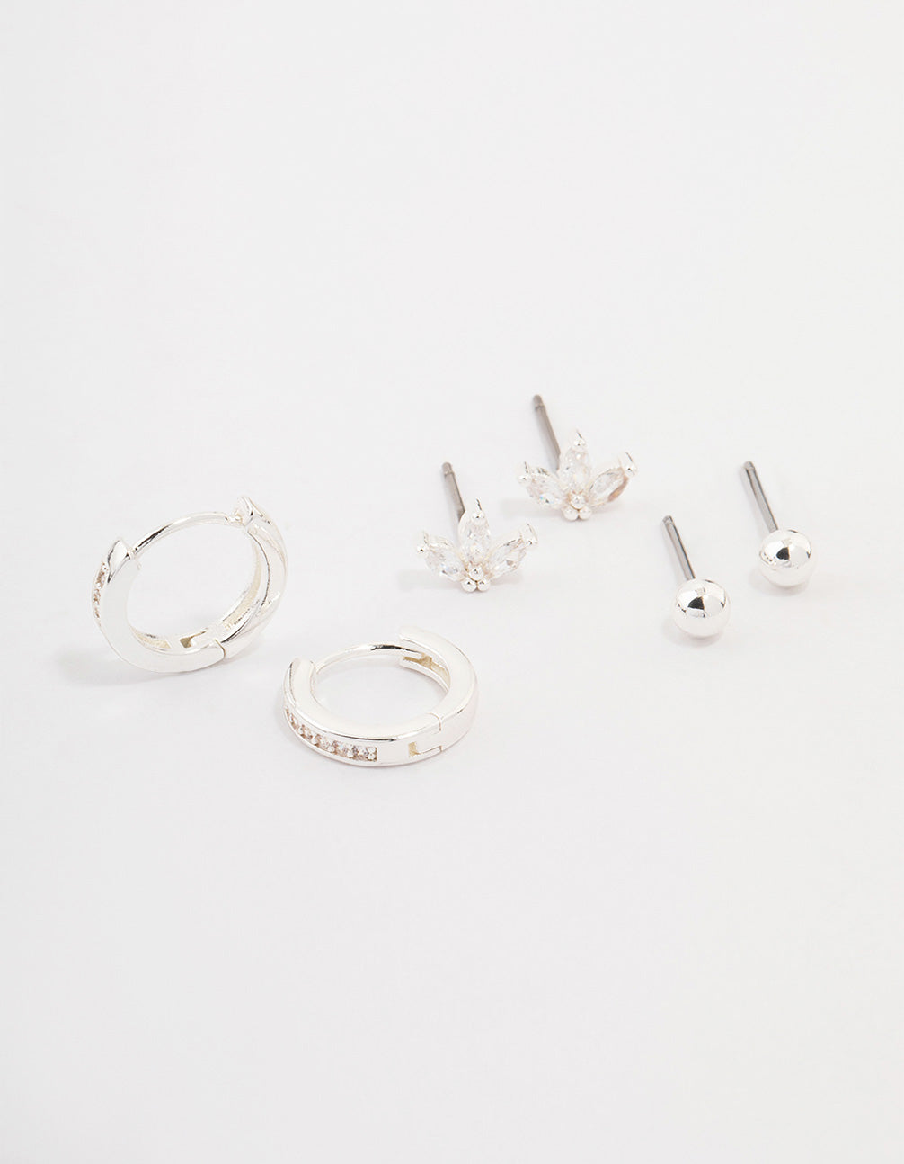 This set of earrings includes three pairs of real silver huggie hoops and studs, perfect for styling together or solo in your stack.