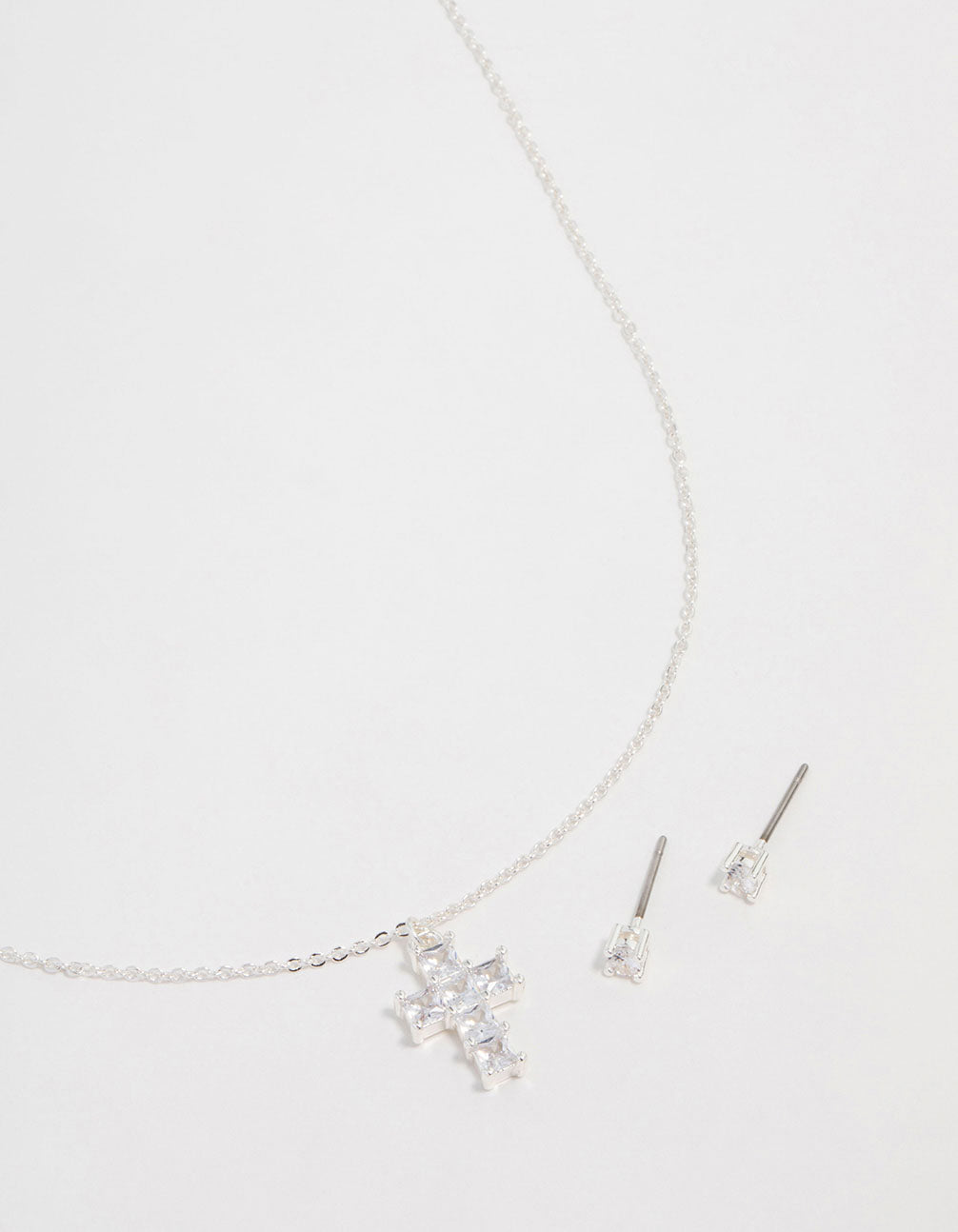 Elevate your daily ensemble with a matching necklace and stud earrings set. This sophisticated set features a shiny silver plated delicate chain with a charming cross motif covered in sparkly cubic zirconia gems and dainty cubic zirconia studs.