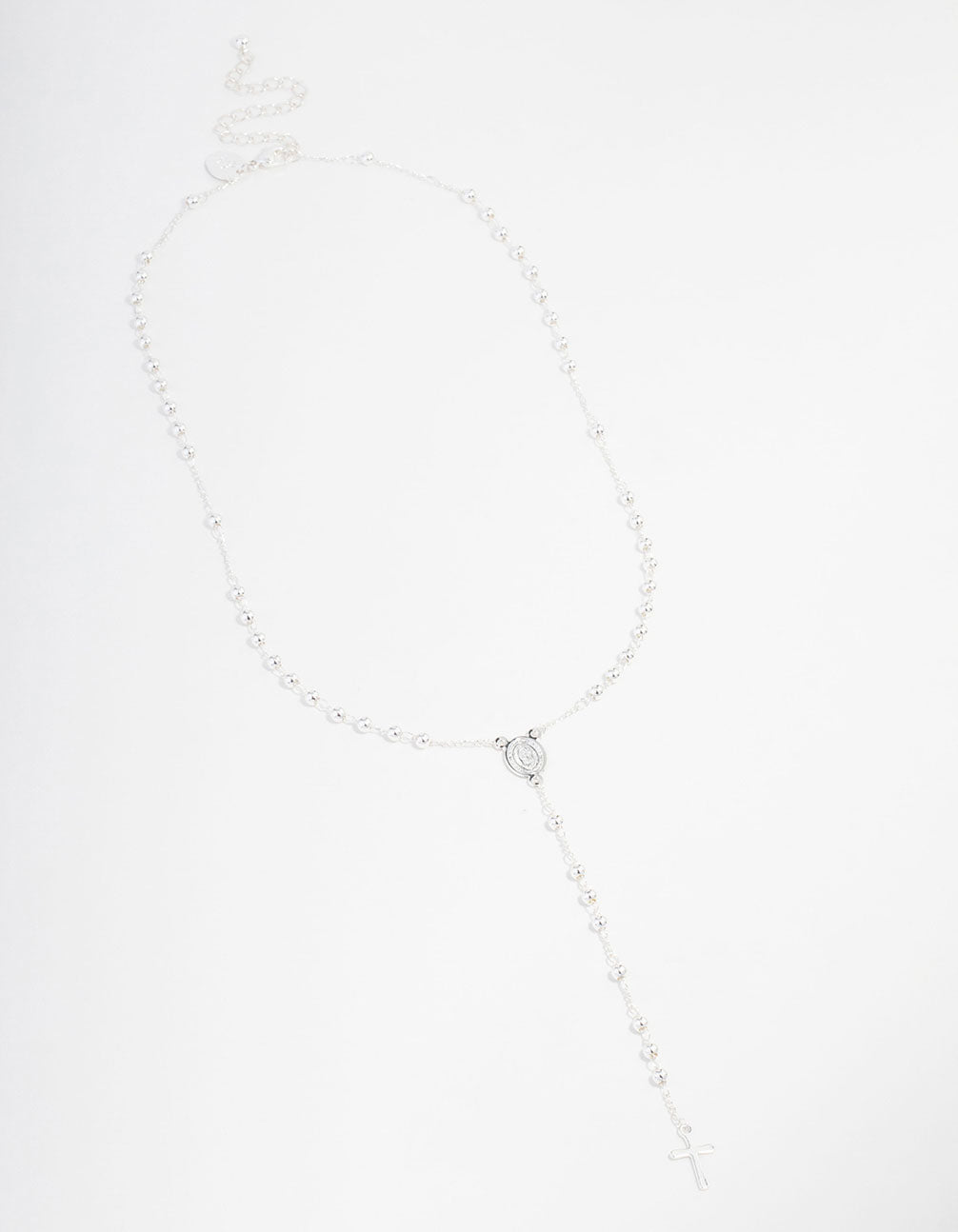 This silver plated elegant lariat necklace features a pretty coin and a hanging cross motif feature. Simple yet stylish, this necklace will add understated glamour to your look.
