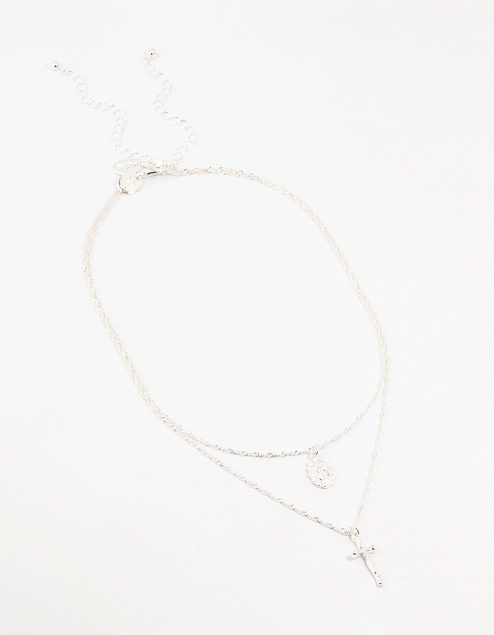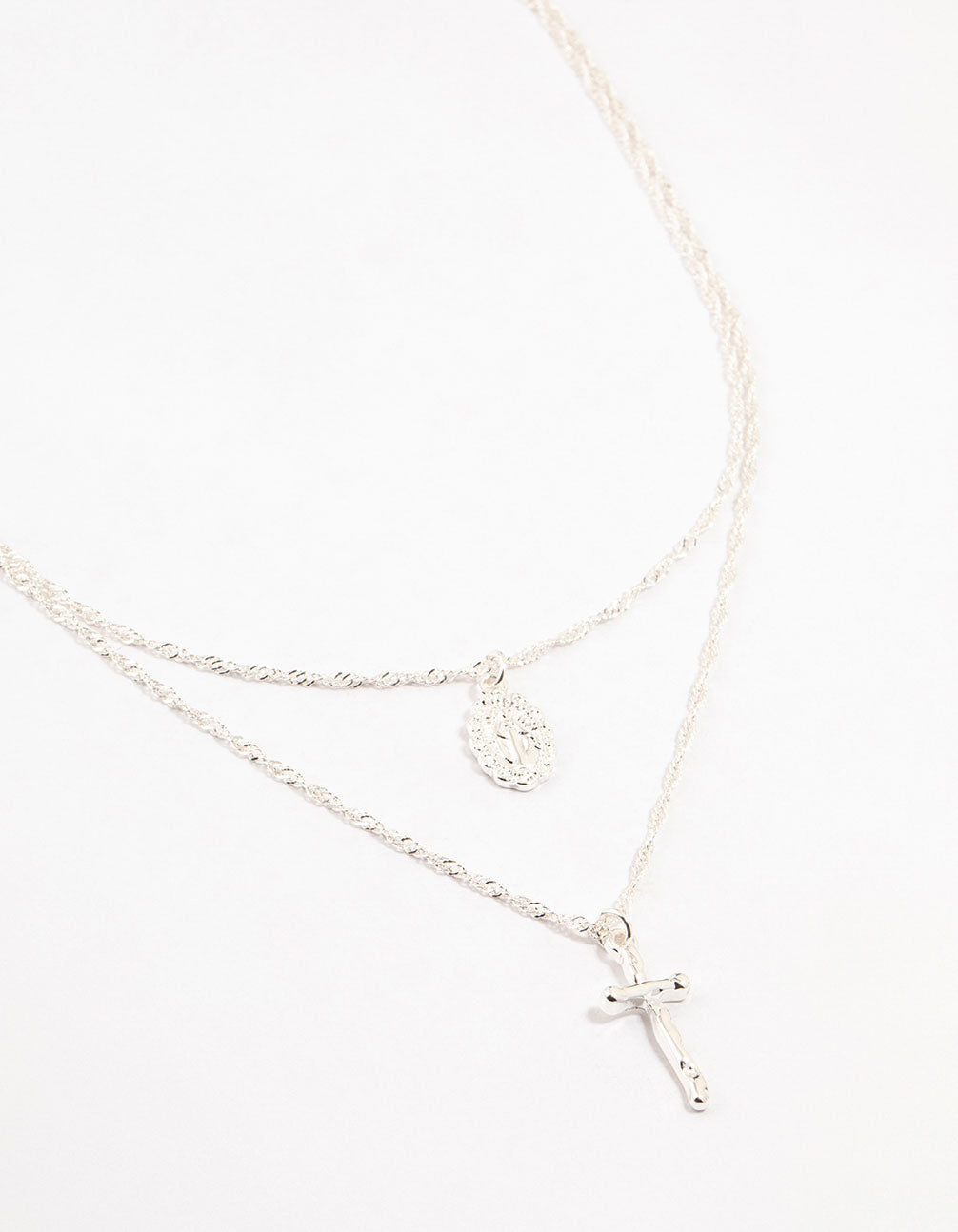 Double the style with these two silver-plated necklaces. Choose between the delicate Mary pendant or the hammered cross pendant—layer them for a chic look or wear solo for a sleek touch.