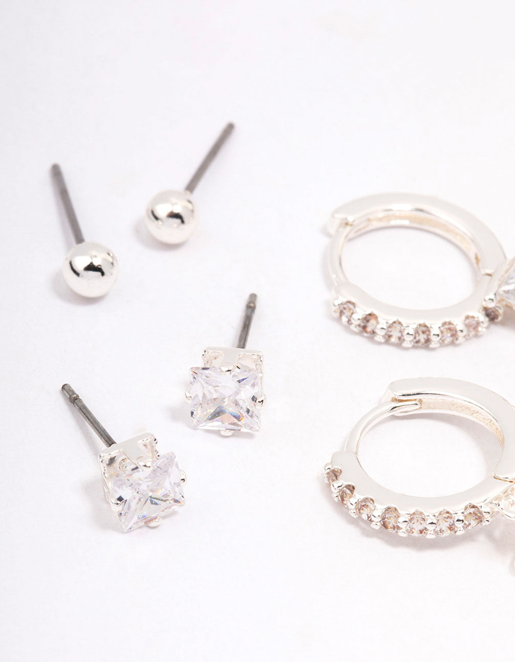Curate the ear stack of your dreams with this set of silver plated earrings. This earring pack contains a pair of huggie hoop earrings, and three pairs of studs. Each adorned with princess-cut crystals for a touch of sparkle.