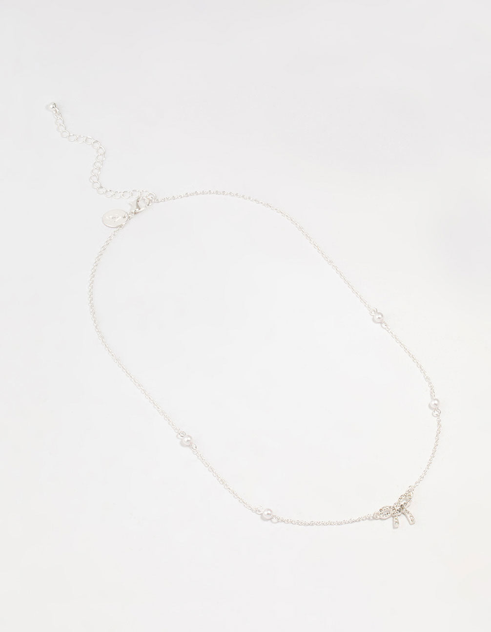 This stunning silver toned necklace features a delicate bow adorned with shimmering pearls and dazzling diamante crystals.