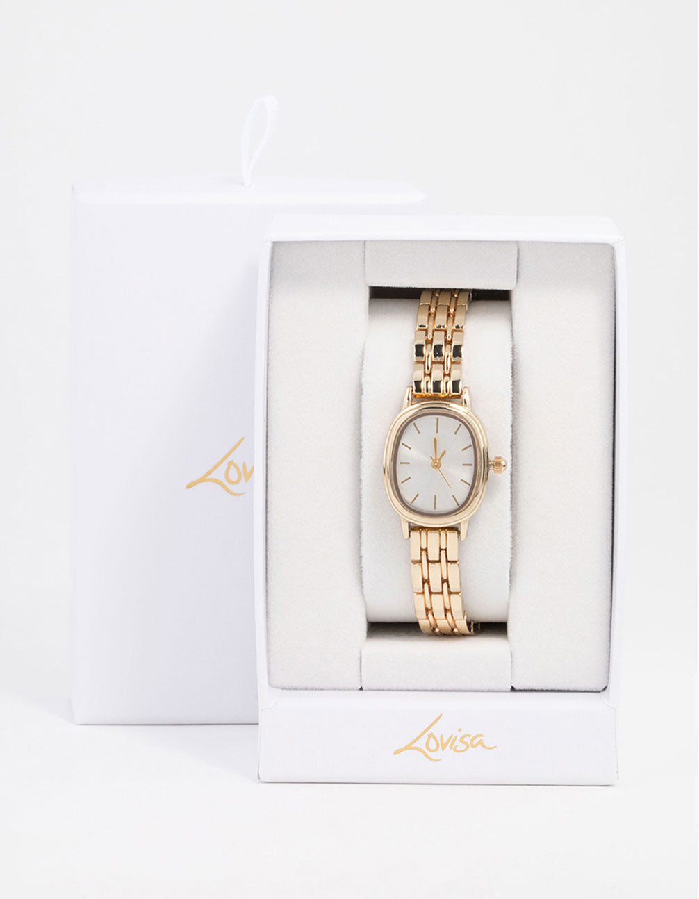 Tell the time in style with this stunning watch. This watch features a cool oval shaped watch face and a sleek gold base, perfect to upgrade your wrist stack and for being stylishly on time.