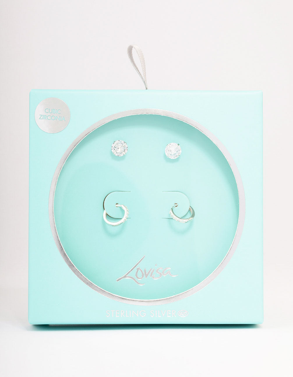 This gift box contains a set of sterling silver studs and huggie earrings adorned with cubic zirconia crystals for a glamorous finish.