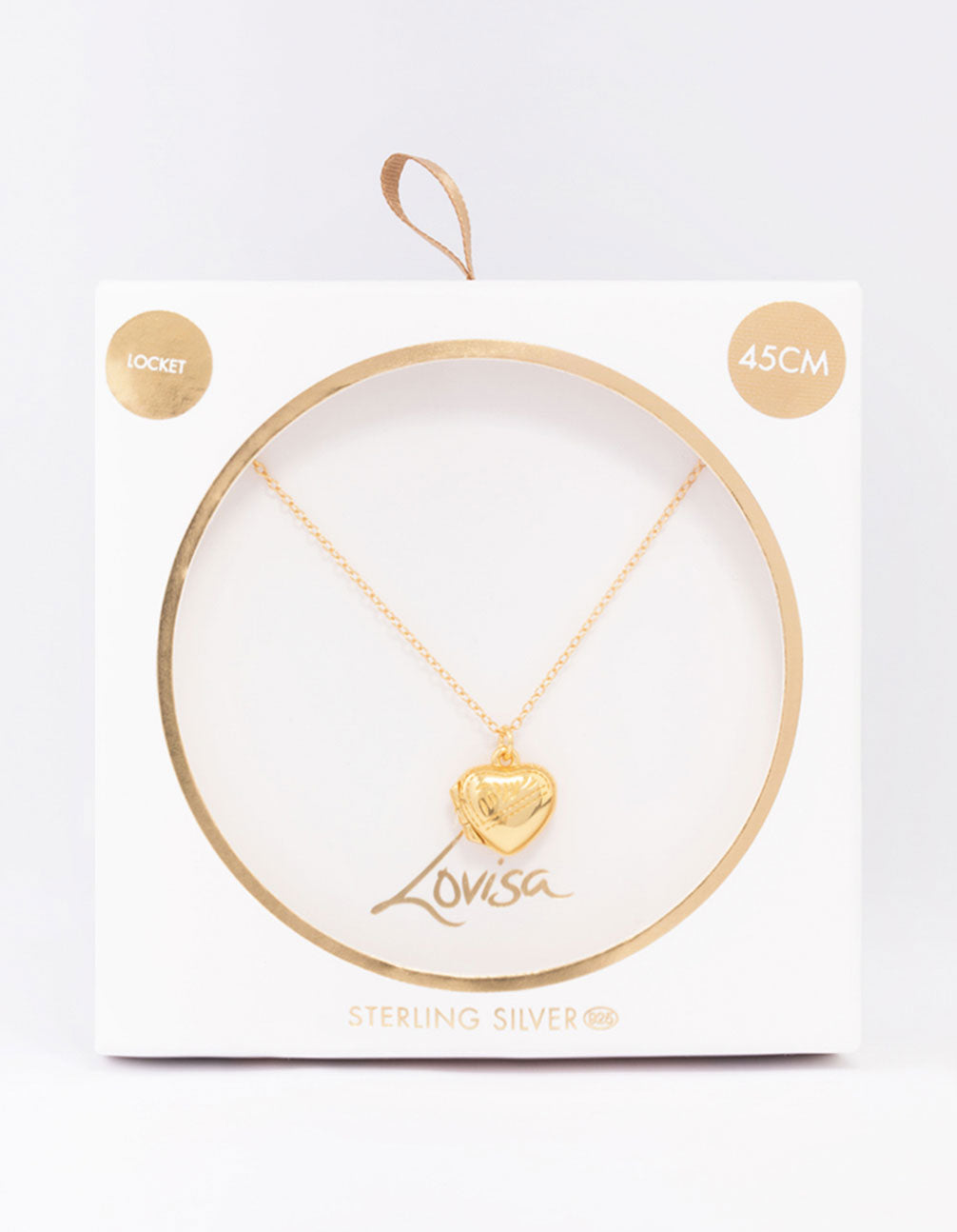 This gift box contains a signature gold plated pendant necklace, adorned with a decorative heart locket for a timeless finish.