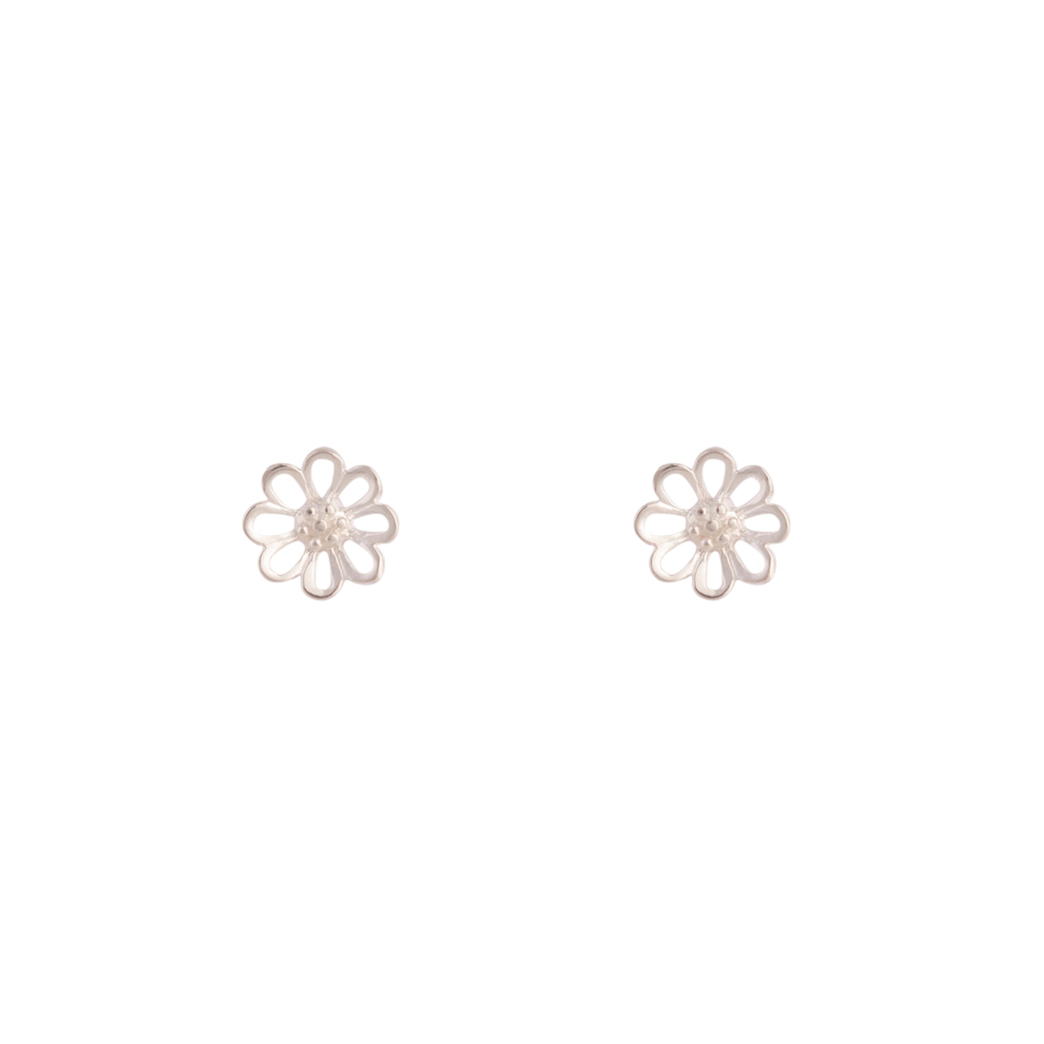 A pair of sterling silver stud earrings with a daisy cut-out design.