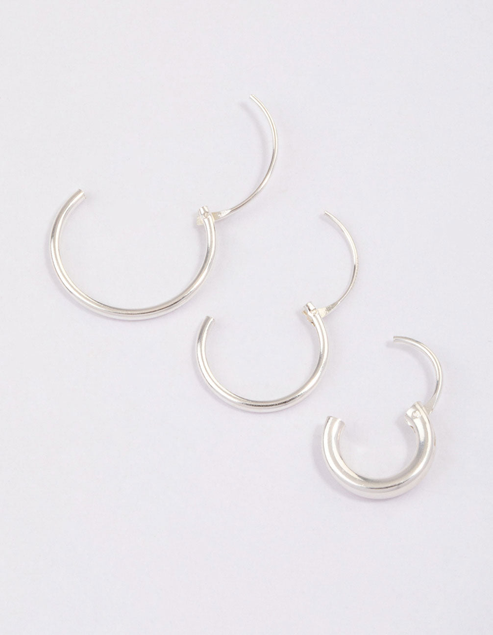 - Style this set of three Sterling Silver Mixed Thick Hoop Earrings together for a layered look or solo for a minimalist-inspired finish.