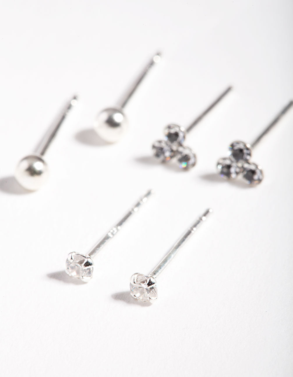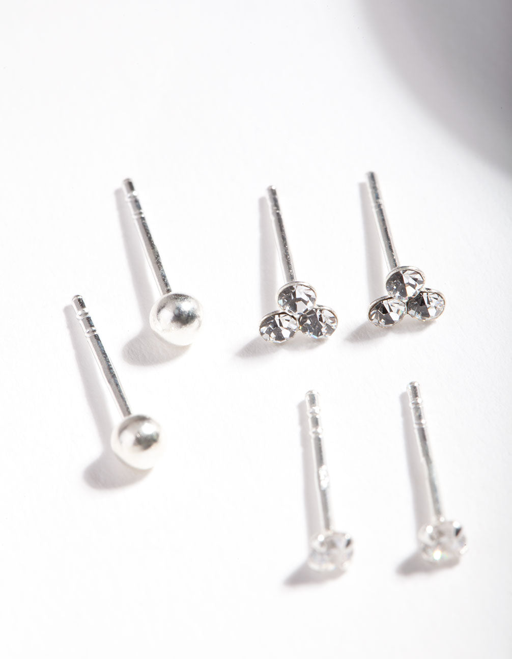 Attract light and shine with classic sterling silver jewellery embellished with cubic zirconia stones. These flawless stones are the perfect way to bring that added bit of sparkle to your collection. This pack comes with a trio of mini stud styles, perfect for stacking in multiple piercings.