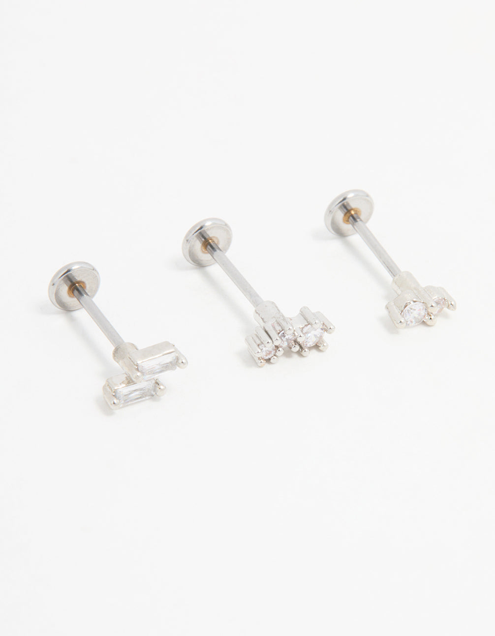 Surgical Steel Cubic Zirconia Double Baguette Flat Back Studs 3-Pack