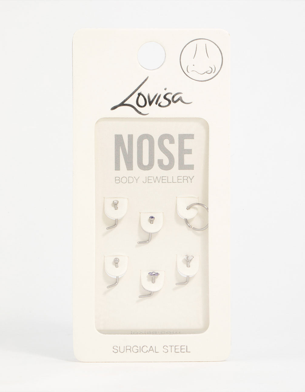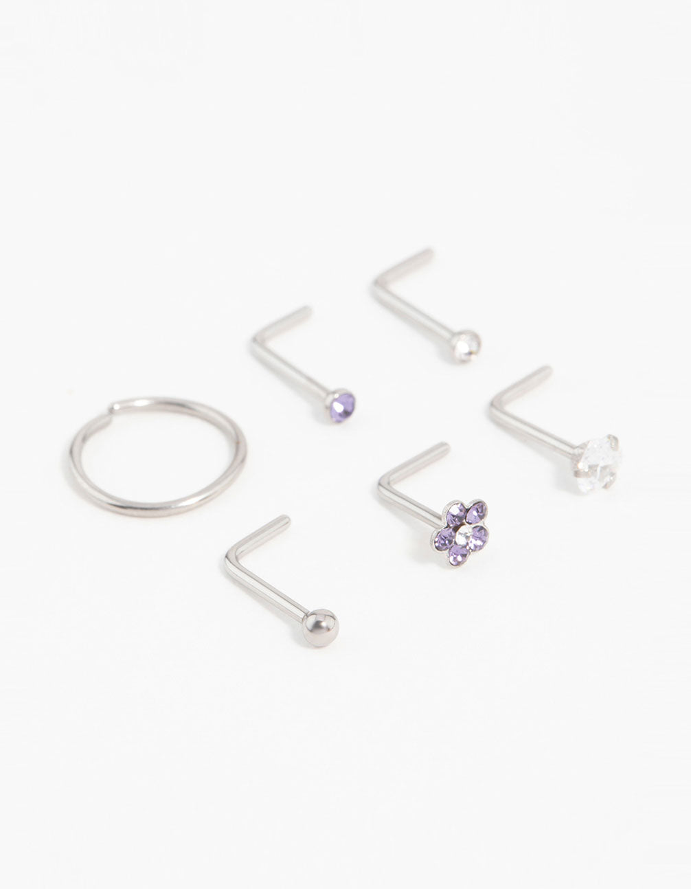 Upgrade your piercing style with this Surgical Steel Cubic Zirconia Flower Nose Piercing Pack! This versatile set has everything you need to mix and match your look. It features a sleek nose ring, a polished ball nose stud, a sparkling cubic zirconia flower stud, a charming heart-shaped stud, a purple cubic zirconia gem stud, and a classic cubic zirconia stud. Made from surgical steel, these nose piercings are durable, stylish, and perfect for everyday wear or special occasions.