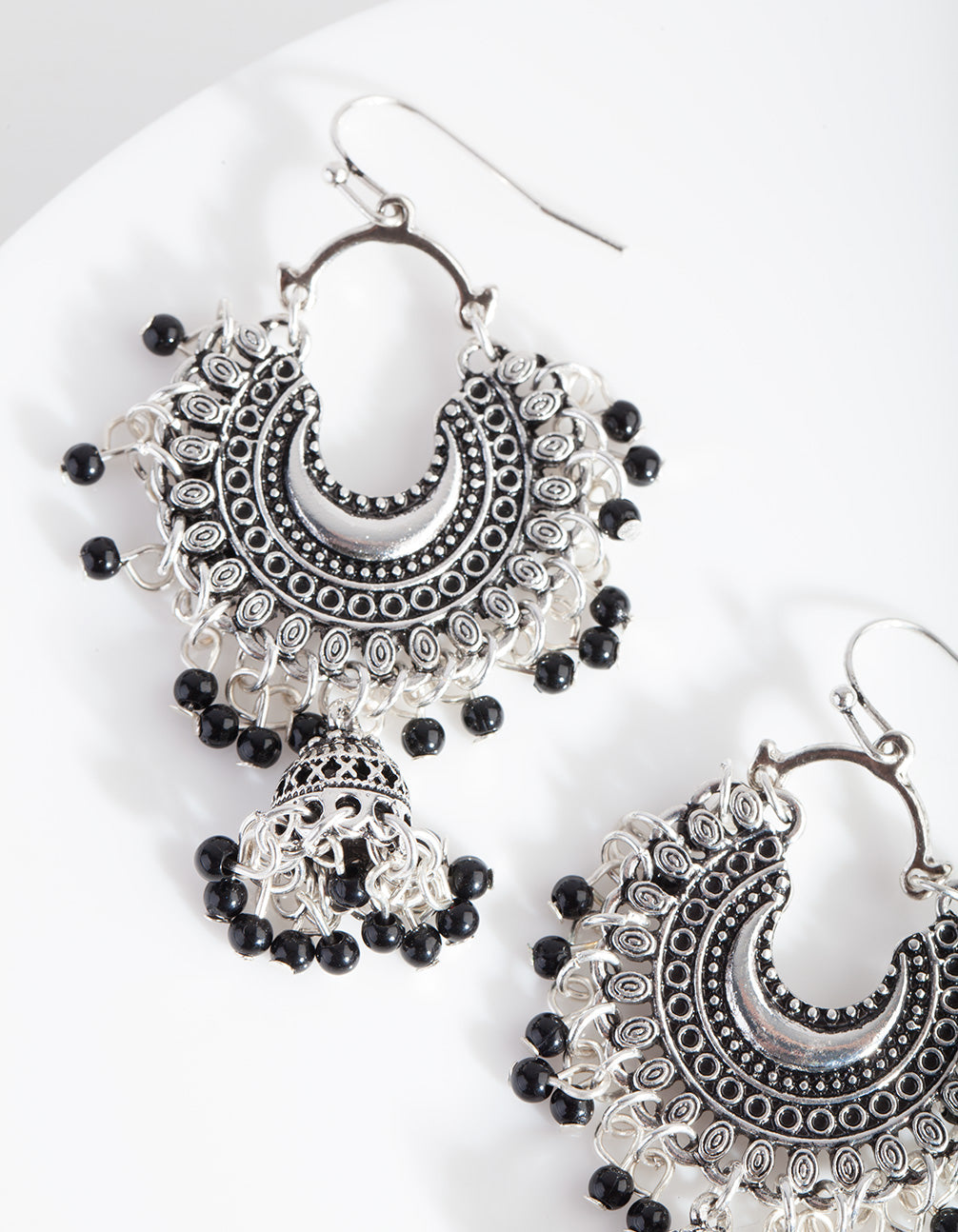 This favourite has been recreated in mini! These earrings feature an antique silver toned setting with black beads.