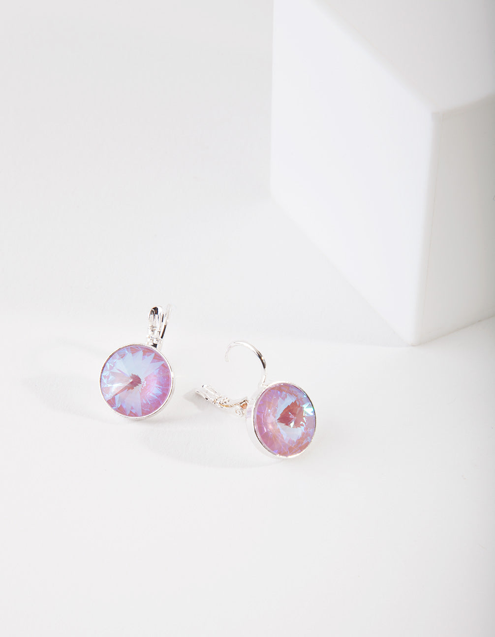 Made using diamond simulant crystals, these drop earrings feature a large, pink, reflective stone in a circular design.