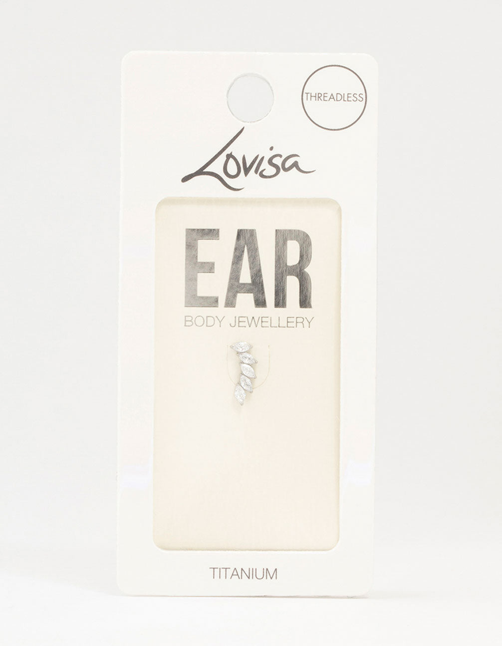 - Features a threadless design, titanium post and cubic zirconia stones.