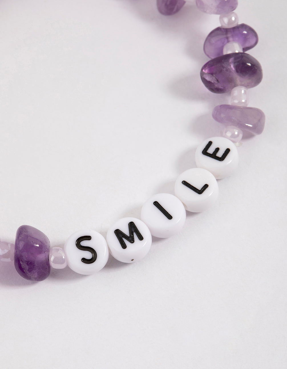 - This bracelet features dainty, amethyst stones and a beaded 'smile' charm.