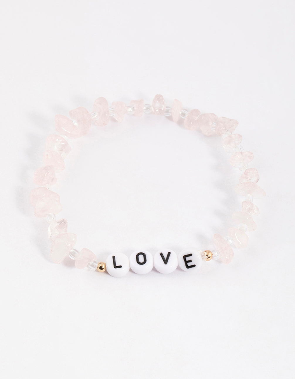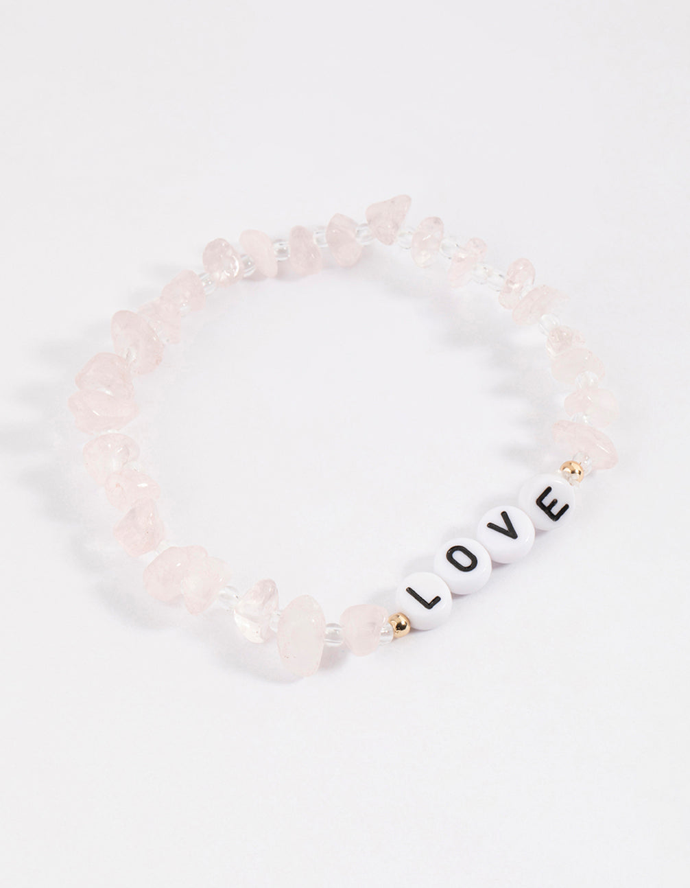This bracelet features dainty, rose quartz stones and a beaded 'love' charm.
