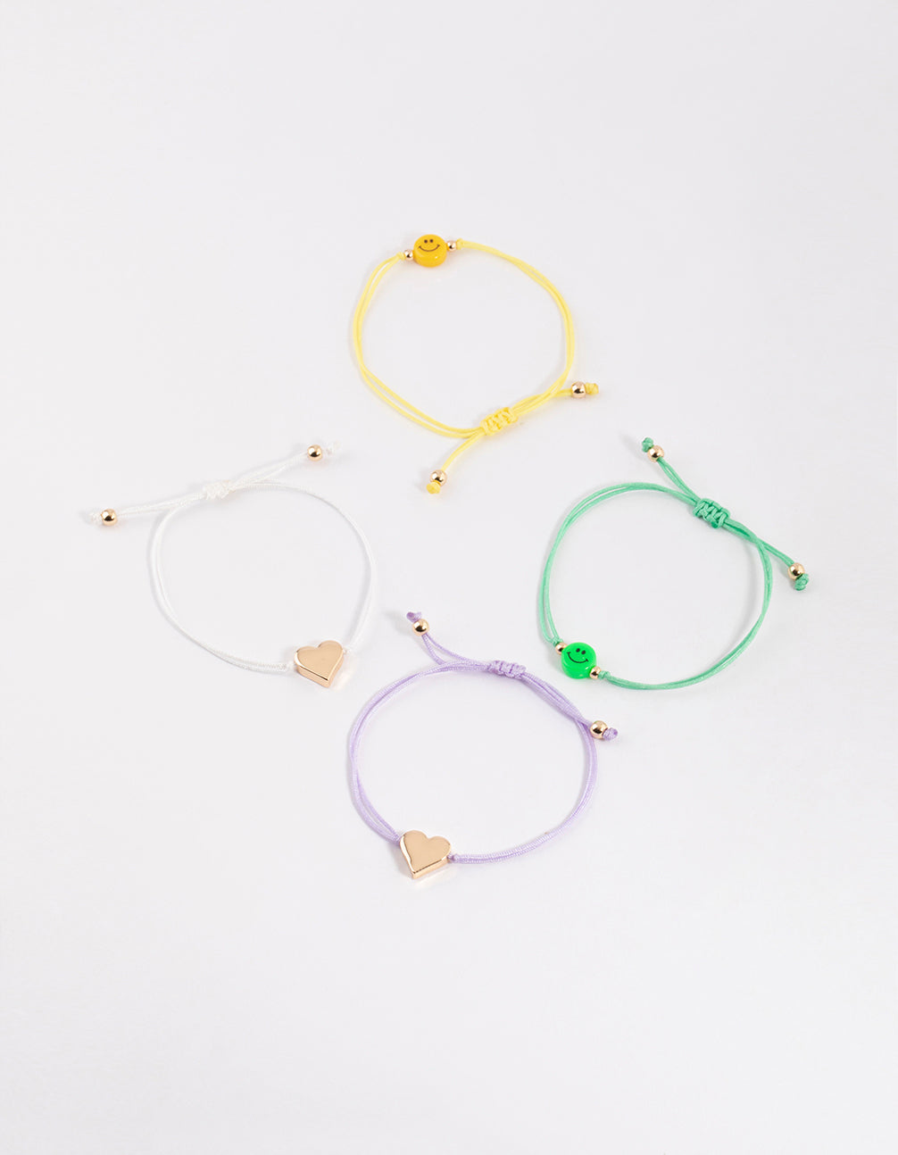 • This bracelet four pack includes four, colourful cord bracelets with smiley face and love heart charms. Style them stacked together for a layered look, or gift the rest to match with your friends!