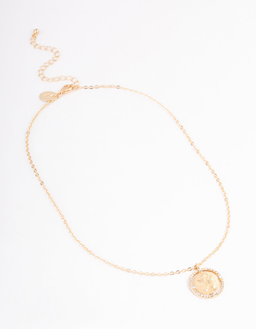 - This necklace features a stunning silver setting with a circular pendant etched with a butterfly symbol.