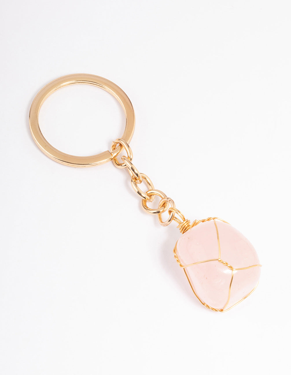 Personalise your keys with a unique keychain! This gold-toned keychain features a gorgeous, rose quartz stone encased in a thin, gold casing.