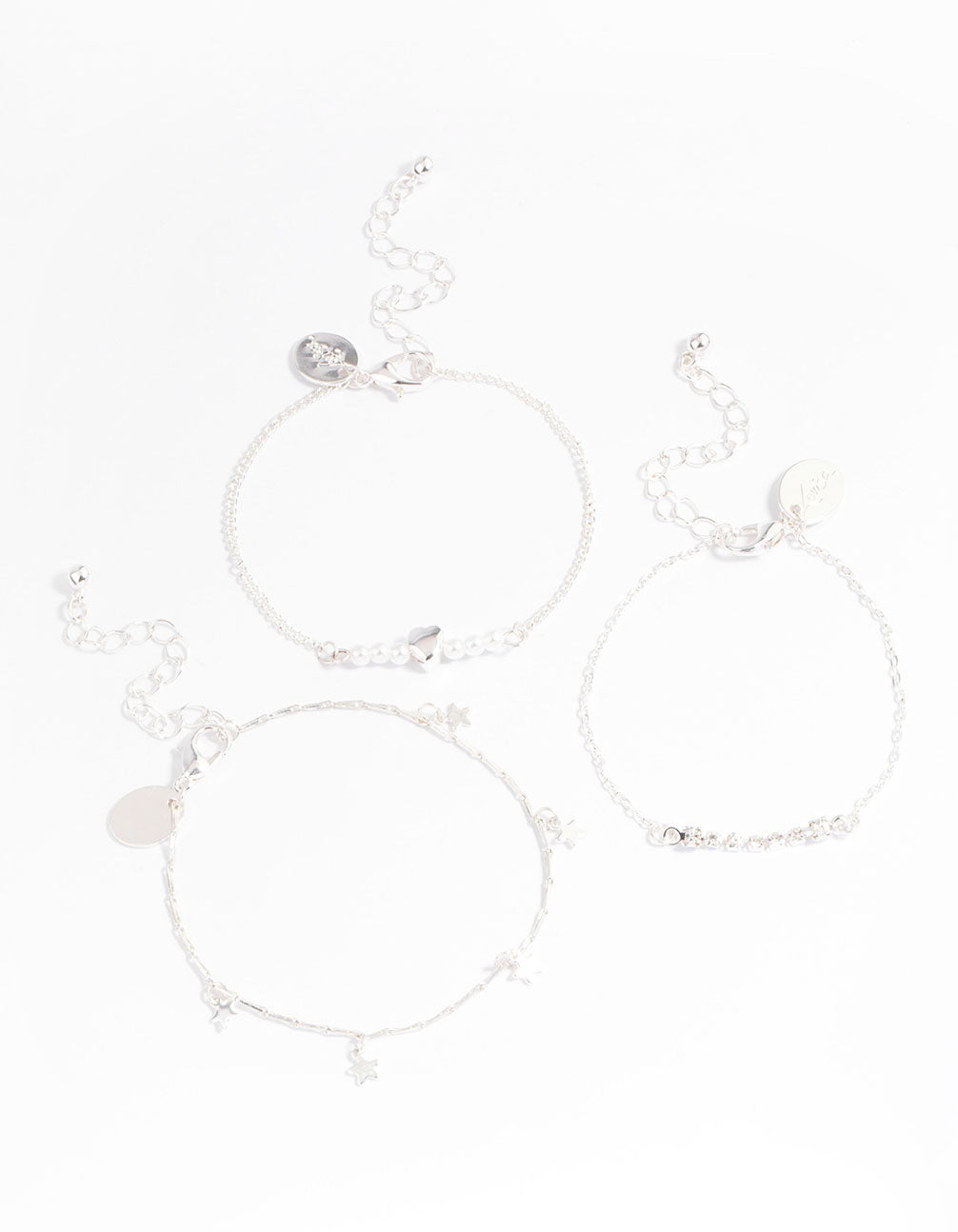 - This bracelet pack contains three individual, silver-toned bracelets with star and heart charms for an embellished finish.
