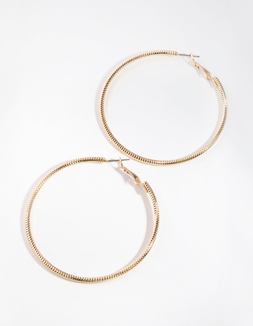 Almost any outfit can be elevated with a pair of hoop earrings. Stylish and versatile, hoops are the ultimate basic. These ones are gold toned, boast an impressive size and are indented to inspire intrigue. Wear them daily, these are outfit staples!