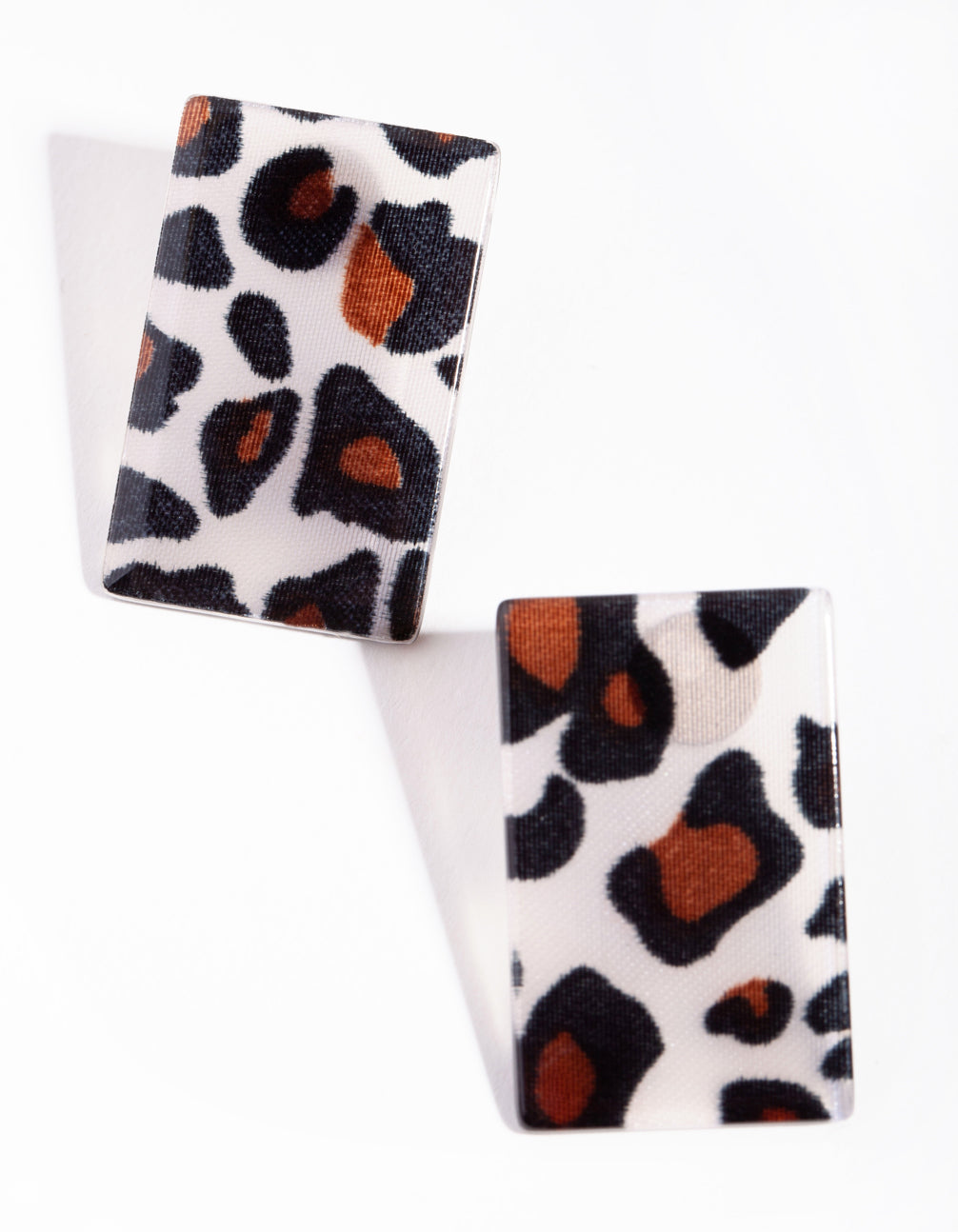 Change up your look with a funky pair of earrings. These fun studs feature a large, clear, rectangular-shaped stud which boasts a leopard print design. Wear them to add some funky flair to your outfits.