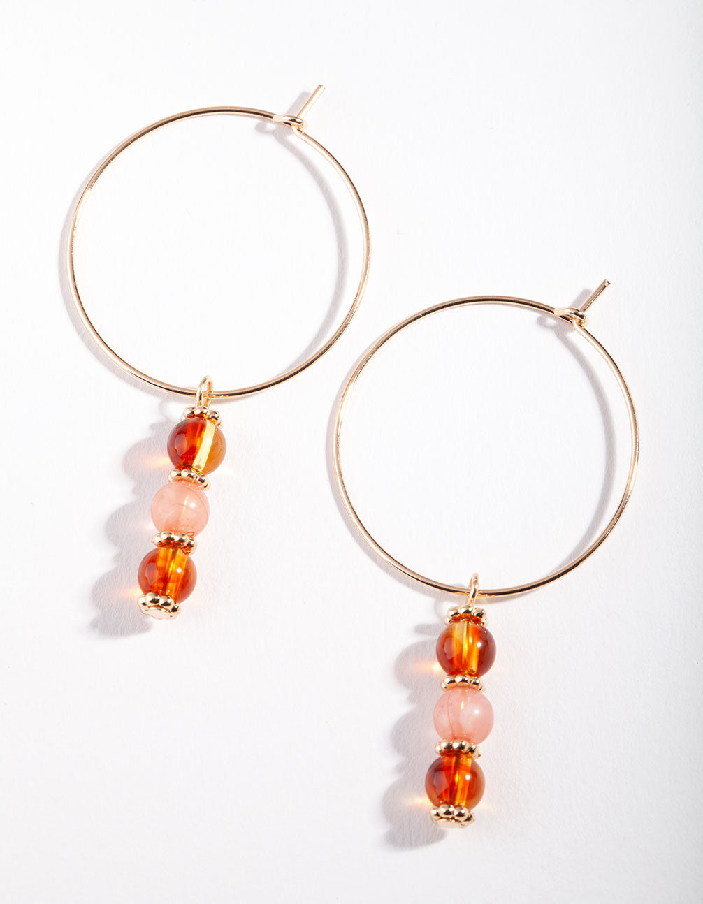 A fun twist on your everyday hoops. This pair feature a gold-toned setting with hanging bead embellishments in neutral colours.