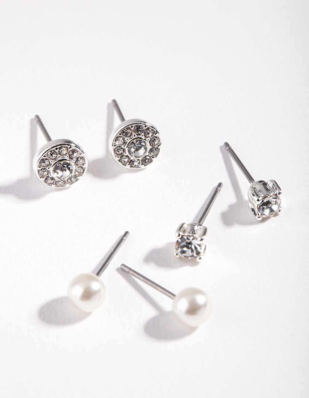 Have an event coming up? Finish off your look with this trio of silver-toned stud earrings with shining diamante embellishments. Style with delicate pearl and silver-toned necklaces and rings for a refined and classic finish.