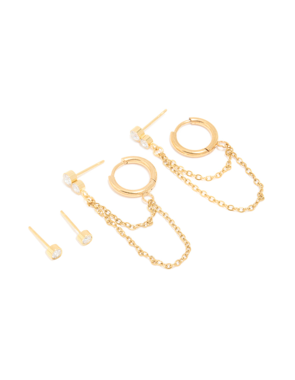 Add a touch of shimmer to your everyday look with this Waterproof Gold Plated Stainless Steel Cubic Zirconia Ear Stacking Pack. Perfect for mixing and matching, this chic jewellery set includes a pair of elegant cubic zirconia ear studs and a pair of cool huggie stud hybrid earrings connected by a delicate chain, all crafted from durable gold-plated stainless steel. Designed to be as practical as they are stylish, these earrings are waterproof—so you can swim, shower, or sweat without a worry. Ideal for casual brunches, beach days, or nights out, they’ll add a subtle shimmer to any outfit, from jeans and a tee to a sleek party dress. Wear them solo for a minimalist vibe or stack them for a bold statement. Your ears deserve the glow!