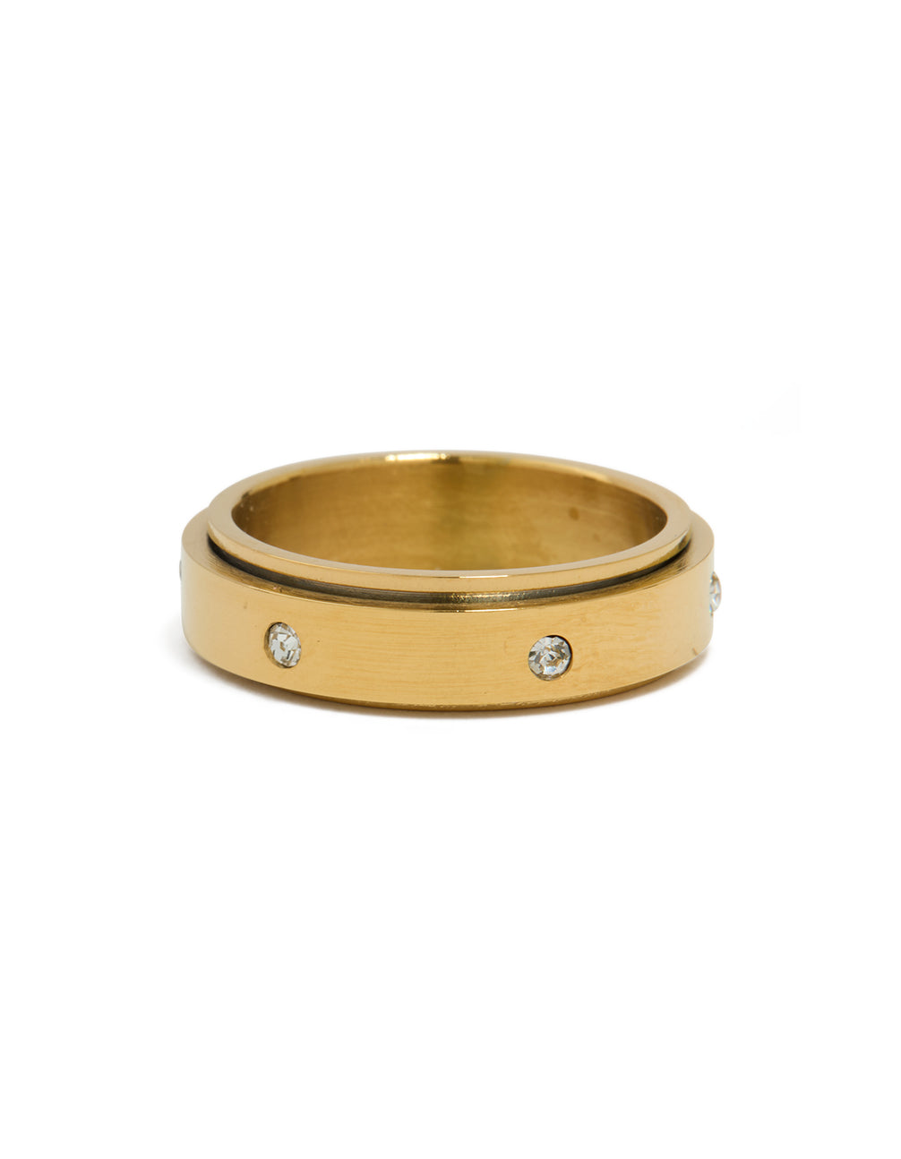 Looking for a ring that's as stylish as it is fun? This Waterproof Gold Plated Stainless Steel Cubic Zirconia Spinner Ring is here to brighten up your jewellery collection! This sleek band combines modern design with playful functionality—spin the outer layer for a subtle fidget moment whenever you need it. Crafted from durable stainless steel with a luxe gold plating, it's sweat, swim, and shower proof, making it perfect for everyday wear. The row of sparkling cubic zirconia crystals adds just the right amount of glam, making this spinner ring ideal for everything from casual outings to dressier occasions. Pair it with other gold bands for a stacked look or let it shine on its own—it's versatile, eye-catching, and ready to go wherever you do!