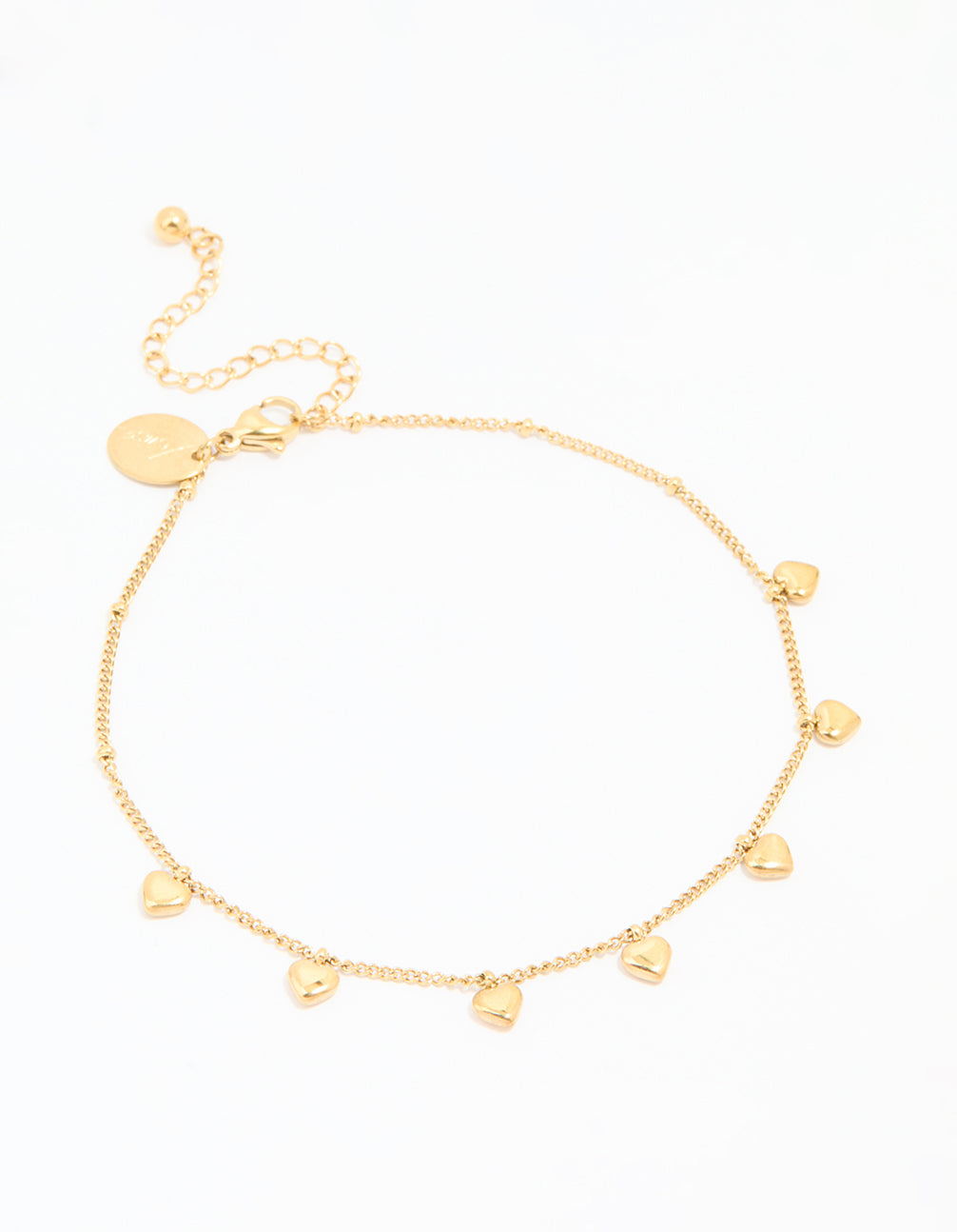 Add a touch of charm to your look with this Waterproof Gold Plated Stainless Steel Heart Charms Anklet. This stylish accessory features delicate heart-shaped charms, making it the perfect blend of playful and chic. Crafted from durable stainless steel with a luxurious gold plating, this anklet is fine waterproof, so it's ready for anything – from sandy beach strolls to poolside lounging. Lightweight yet eye-catching, it's ideal for sunny holidays, summer festivals, or simply elevating your everyday outfits. Pair it with sandals and a flowy dress for a breezy vibe, or layer it with other accessories for a bold, stylish statement. A must-have anklet that's as versatile as it is gorgeous!