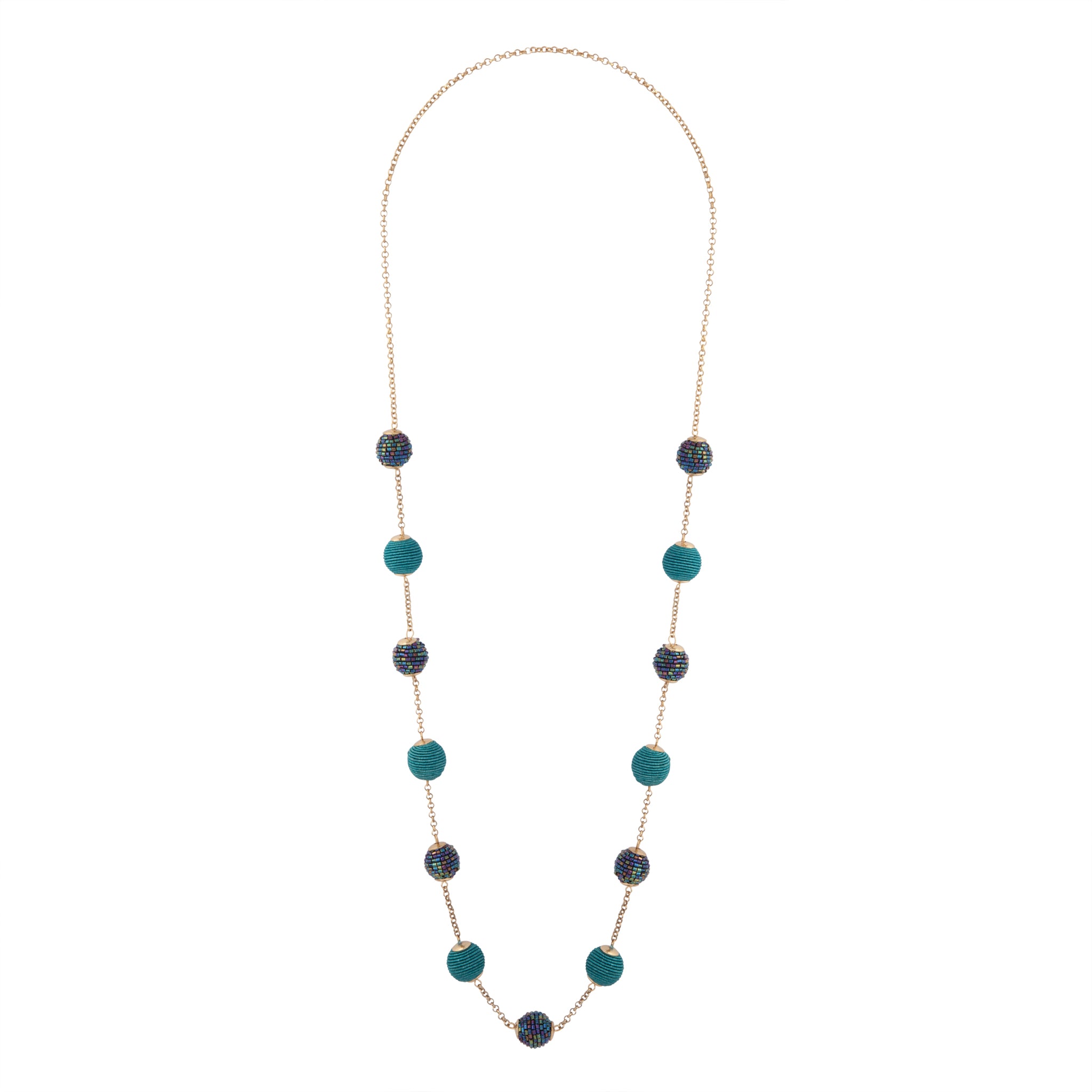 This long infinity style necklace has an antique gold-toned setting with beaded and fabric wrapped pendants in a variety of blue tones.